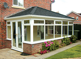 In recent years we have seen tiled roofs become more and more popular for conservatory owners. In fact most of our tiled roof conservatory business is actual upgrades from a standard glass or polycarbonate roof to a lightweight tiled roof. Click here to view our tiled roof conservatory page »